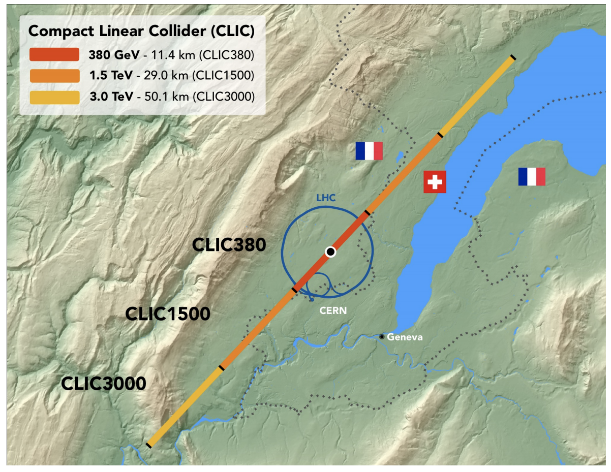 What is CLIC? A nice summary of this future collider project can be found in the talk that Aidan Robson gave at the Nikhef Colloquium recently. CLIC would be a high-luminosity, multi-TeV electron–positron collider to be built at the CERN site which would operate in three phases. The first one, CLIC-1, would have a center of mass energy of 380 GeV and would focus on precision studies of the Higgs boson and the top quark, which are sensitive to potential new physics beyond the Standard Model (SM) via quantum corrections. Such program is to common to other proposed lepton colliders such as the International Linear Collider (ILC), the FCC-ee or the Chinese CepC. The key difference of CLIC is that it can be be upgraded to CLIC-2 (operating at 1.5 TeV) and then CLIC-3 (at 3 TeV), being thus the only lepton collider over the table that can reach the multi-TeV region. This offers significant advantages, both in terms of guaranteed deliverables (such as the measurement of the Higgs potential) as well as a marked increase in the reach for direct and indirect physics beyond the SM. Moreover, this upgrade program could be adjusted to other center of mass energies after stage-1, provided there is a good scientific motivation for that.