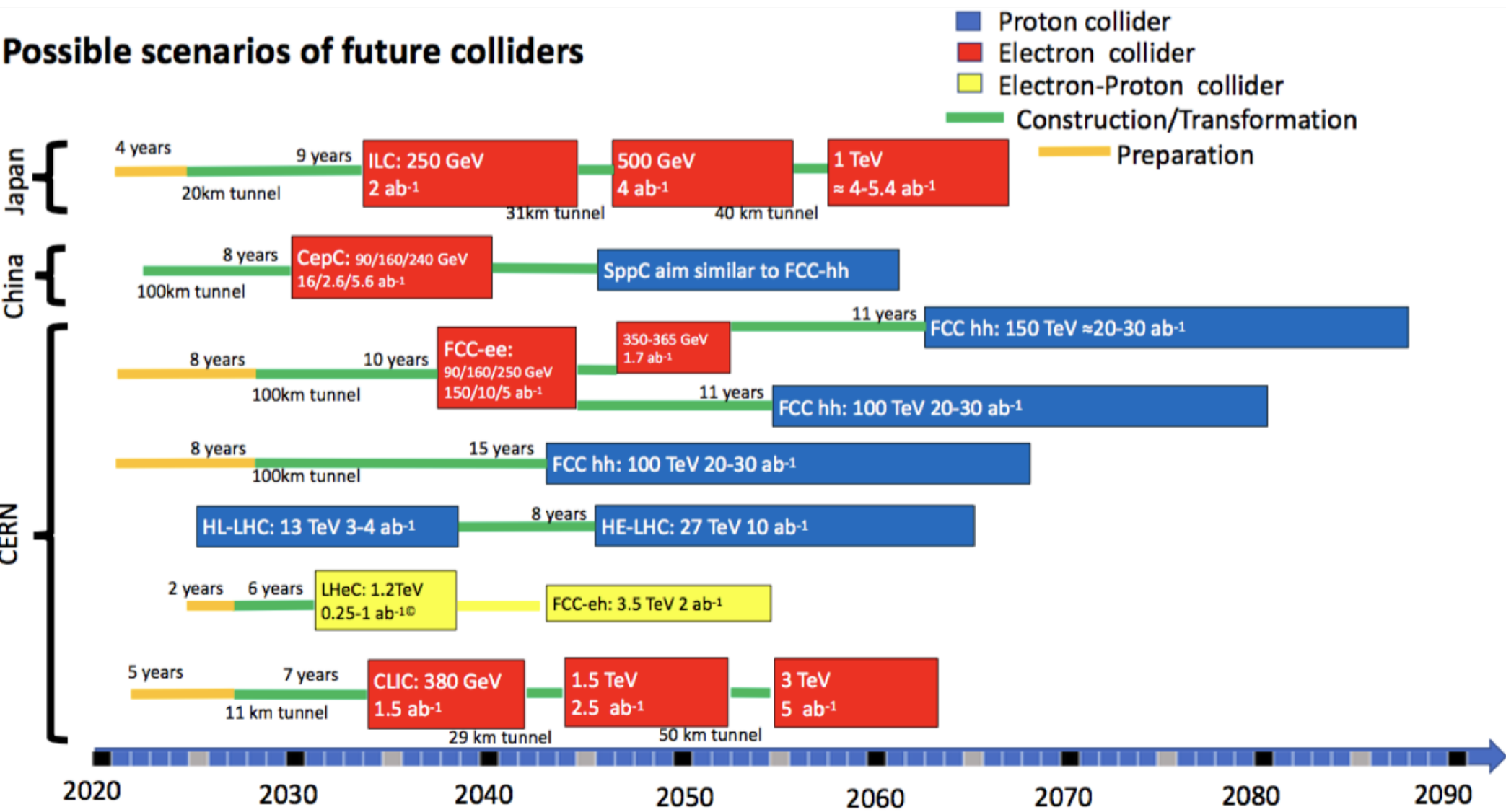 The question of the timescales is also of paramount importance in this discussion: as mentioned above, ideally one would like the next collider to start operation as soon as HL-LHC is completed (if built on the CERN site) or as soon as possible if it is built in some other location, in Asia for example. According to the timeline below, both CLIC and the ILC could start operation as soon as 2034, with CepC even a few years earlier. FCC-ee would start shortly afterwards, but with as many attractive features as it has, it would also delay the start of the CERN’s 100 TeV hadron collider by up to around 2060 at the earliest. Even by the standards of high energy physics, this is perhaps planning far too long in the future: I will be lucky to be around to see the first 100 TeV collisions, though perhaps I will have uploaded my brain to the cloud by then ;). This is thus another important factor to take into account in the discussion for future colliders: is it wise to plan ahead that far in the future? Maybe, I don’t have the answer for this question. In this context, another of the selling points of CLIC is that its energy can be adjusted to tailor to any new developments on our field, for example, hints or even discoveries of new physics that might be provided by the HL-LHC or evidence for heavy dark matter particles. In this case these new insights could be use to tune the center of mass energy of CLIC after the initial (Higgs and top factory) stage to ensure a maximal scientific return.