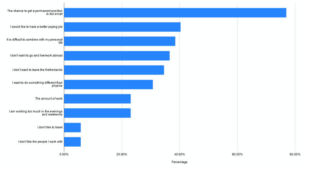 The second most frequent consideration pointed out by the respondents concerning the reasons to drop science was aiming to a better salary. I have to say that was a bit surprised to see this result in a survey from Dutch PhD students, which enjoy in comparison with most other countries very generous employment conditions and benefits. As someone who never earned more than 1000 euros per month (without benefits) during my PhD, the Netherlands offers outstanding work conditions for PhD students, though perhaps it is true that graduates can land better paying jobs outside academia. In this context, perhaps one should also point out that no one complained about physics being dull or boring or that the Nikhef research environment was not supportive. So even the reasons for leaving science are quite telling, imho, about the reasons why these respondents accepted starting a PhD to begin with, if one considers also the “missing” answers.
