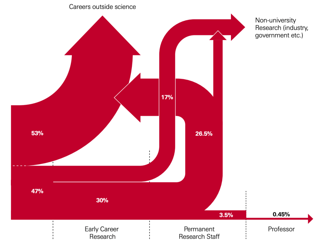 There are different estimates and large variations by country and discipline (see also the Royal Society chart below) about the chances of getting a permanent job. However, one sensible ball park estimate is that no more than 10% of the PhD graduates will end up landing a permanent research position, and perhaps only 2% or 3% will ever each the university professor level. The fact that chances are not that great rings true even for graduates of world-leading universities: a survey of PhD graduates from the theoretical condensed matter group of the University of Oxford revealed that less than one third of their students ended up in academic jobs (source: informal discussions with a local academic colleague while we monitored our kids playing in the park). Actually, these career perspectives are even gloomier if one considers that after the PhD comes typically a long string of temporary research gigs (postdocs) often involving moving country before one can eventually land a tenure-track faculty job. So it not only that chances are small, also that, irrespective of the outcome, you are expected to spend several years in temporary jobs in different institutions. Further, not everyone plays under the same rule in this game: caring responsibilities and financial considerations often unfairly disadvantage some scientists at this stage of their careers. Again and again, the dismal situation of the academic job market and the lack of compatibility with personal situations and constraints are mentioned as the one of the main reasons to drop science after the PhD.