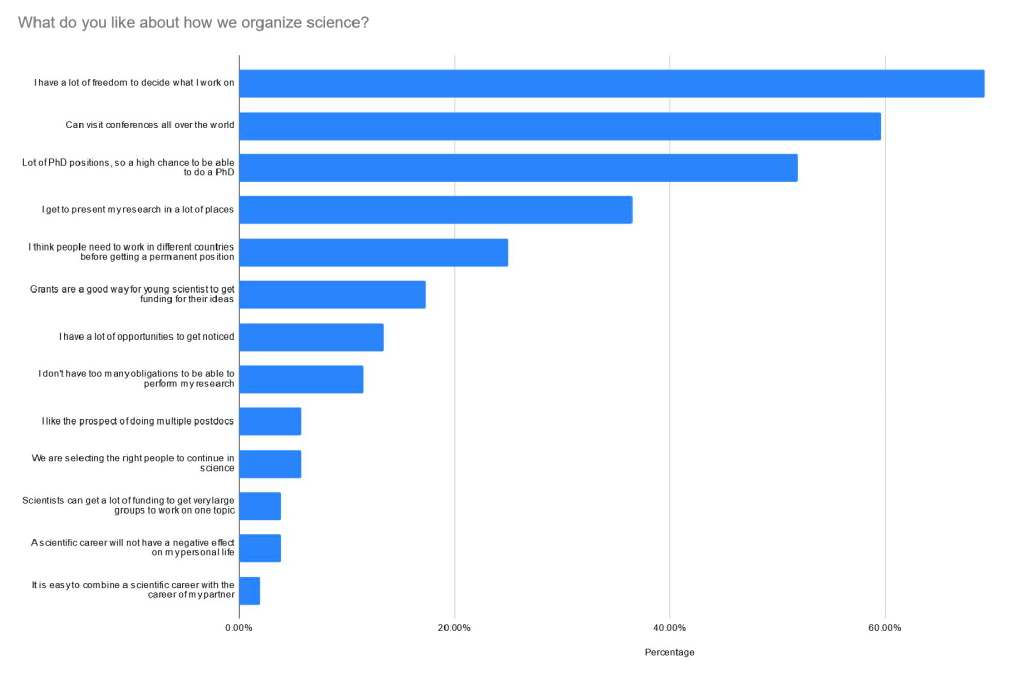 Another of the questions that were asked as part of this survey were related to the current way in which science is organised. Here there was a higher diversity of options. The aspect that was more highlighted by the respondents was that of the freedom to organise their own work. This freedom is something that e.g. is absent in company world. Being able to travel and meet fascinating people are over the world is (was?) also an aspect well appreciated.